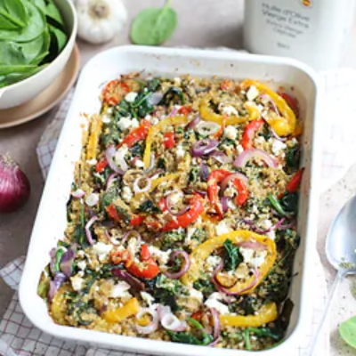 A wholesome, oven-baked dish combining nutrient-rich quinoa with a medley of fresh vegetables, topped with a golden, melted cheese crust. Comforting, nutritious, and satisfying, perfect as a main or a hearty side.